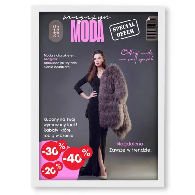 Poczuj się jak modelka z pierwszych stron magazynów! Personalizowany plakat „Magazyn MODA” ze zdjęciem to elegancki i nowoczesny prezent dla kobiety, która kocha styl, modowe inspiracje i piękne detale. Wystarczy przesłać zdjęcie, imię oraz dedykację, a my zamienimy je w profesjonalną okładkę w stylu prestiżowego magazynu modowego.
