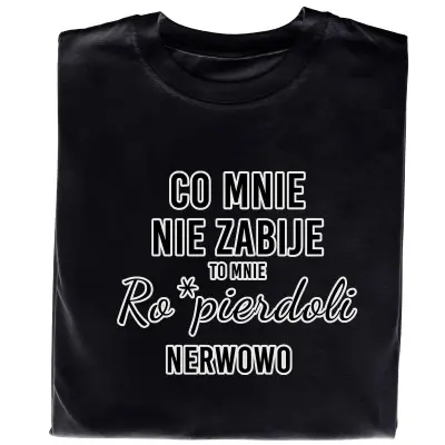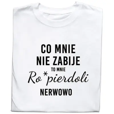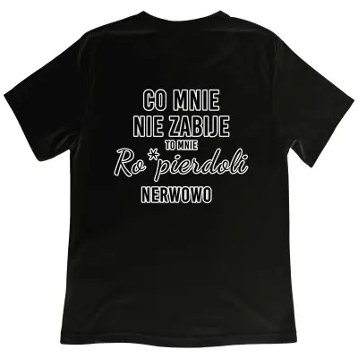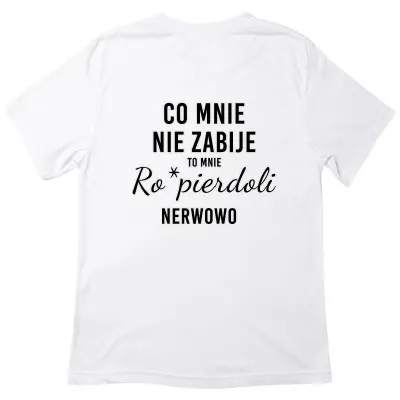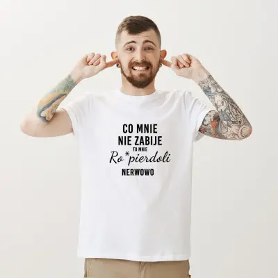 Koszulka z nadrukiem „Co Mnie Nie Zabije, To Mnie Ro*pierdoli Nerwowo” to propozycja dla osób z ostrym poczuciem humoru i dużym dystansem do życia. Wyrazisty, sarkastyczny tekst trafia w punkt i świetnie oddaje codzienne zmagania z rzeczywistością — oczywiście z przymrużeniem oka.