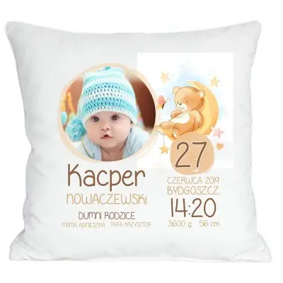 METRYCZKA NARODZIN W FORMIE FOTO PODUSZKI Z TWOIM ZDJĘCIEM – to piękny prezent z okazji narodzin maluszka, roczku, urodzin,chrztu. Przepiękny element wyposażenia pokoju dziecka i wspaniała pamiątka.