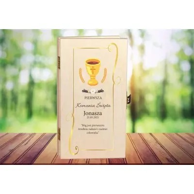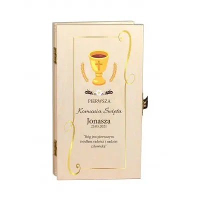 Drewniane pudełko personalizowane na pieniążki lub czekoladę z życzeniami świetnie sprawdzi się zamiast tradycyjnej kartki.