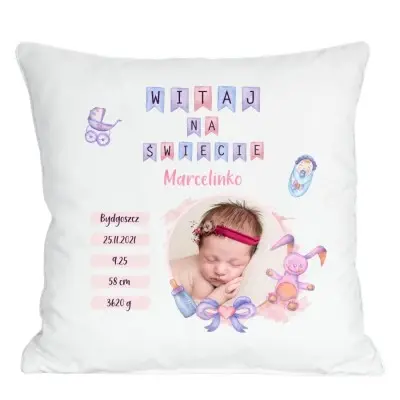 METRYCZKA NARODZIN W FORMIE FOTO PODUSZKI Z TWOIM ZDJĘCIEM – to piękny prezent z okazji narodzin maluszka, roczku, urodzin, chrztu. Przepiękny element wyposażenia pokoju dziecka i wspaniała pamiątka.