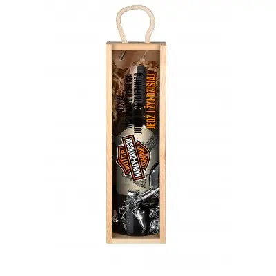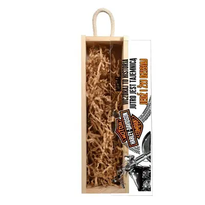 Elegancka, personalizowana skrzynka na wino została wykonana z wysokiej jakości drewna sosnowego, z wieczkiem ze szkła akrylowego i wygodnym uchwytem z naturalnego sznurka.  Jest to świetna oprawa dla każdego trunku, który chcemy podarować w prezencie.