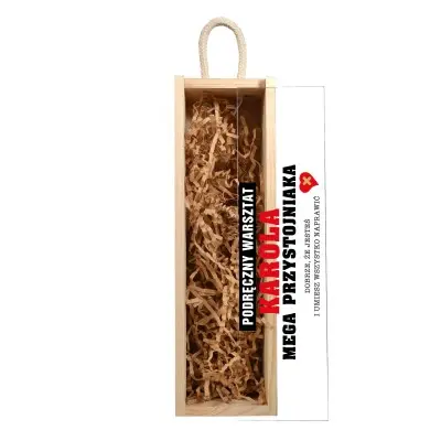 Elegancka, personalizowana skrzynka na wino została wykonana z wysokiej jakości drewna sosnowego, z wieczkiem ze szkła akrylowego i wygodnym uchwytem z naturalnego sznurka.  Jest to świetna oprawa dla każdego trunku, który chcemy podarować w prezencie.
