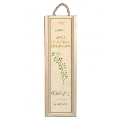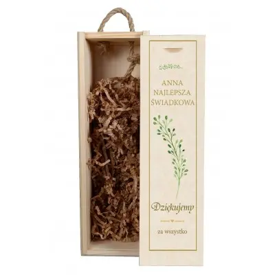 Szukasz czegoś oryginalnego, aby podziękować świadkowej? Skrzynka na alkohol to idealny i wyjątkowy upominek. W dodatku może przydać się nie tylko do przechowywania alkoholu, ale także na trzymanie w niej drobiazgów. Posiada zasuwane wieczko oraz praktyczny uchwyt ze sznura jutowego. Posiadamy również wersję dla świadka.
