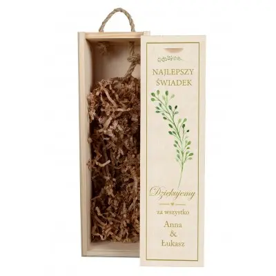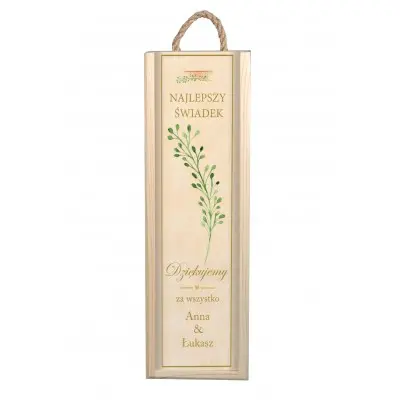 Szukasz czegoś oryginalnego, aby podziękować świadkowi? Skrzynka na alkohol to idealny i wyjątkowy upominek. W dodatku może przydać się nie tylko do przechowywania alkoholu, ale także na trzymanie w niej drobiazgów. Posiada zasuwane wieczko oraz praktyczny uchwyt ze sznura jutowego. Posiadamy również wersję dla świadkowej.