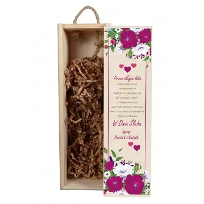 Szukasz oryginalnego i ciekawego prezentu na ślub? Drewniana skrzynka na wino jest idealnym rozwiązaniem. Może przydać się nie tylko do przechowywania alkoholu, ale także na trzymanie w niej drobiazgów. Posiada zasuwane wieczko oraz praktyczny uchwyt ze sznura jutowego. Skrzynka zawiera nadrukowany tekst z życzeniami oraz grafiką przedstawiającą kwiaty.