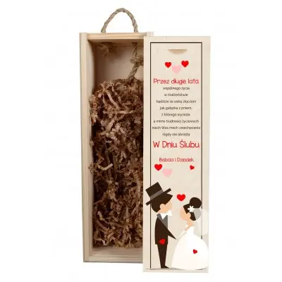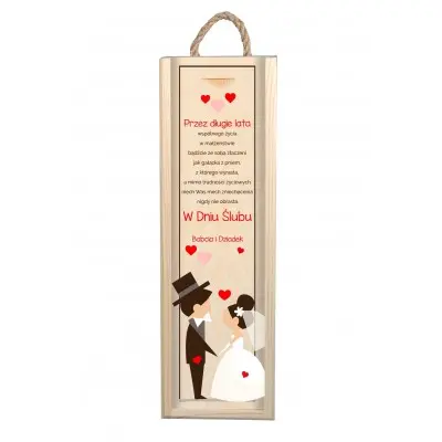 Przedstawiamy idealny prezent z okazji ślubu – personalizowana skrzynka na alkohol, która może przydać się nie tylko do przechowywania alkoholu, ale także na trzymanie w niej drobiazgów. Posiada zasuwane wieczko oraz praktyczny uchwyt ze sznura jutowego. Skrzynka zawiera nadrukowany tekst z życzeniami oraz grafikę przedstawiającą parę nowożeńców.