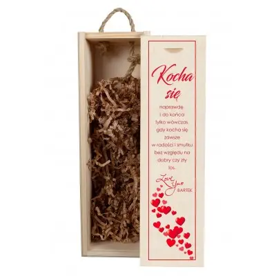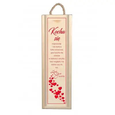Szukasz pomysłu na niecodzienny prezent na urodziny lub inną wspaniałą okazję? Drewniana skrzynka to indywidualny i niepowtarzalny upominek, który z pewnością ucieszy solenizanta. Dzięki personalizacji, prezent nabierze oryginalnego charakteru i będzie wyjątkową pamiątką na lata. Może przydać się nie tylko do przechowywania alkoholu, ale także na trzymanie w niej innych przedmiotów i drobiazgów. Zawiera tekst z sentencją o miłości w kolorze czerwonym oraz czerwone serduszka.