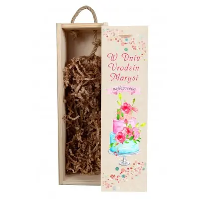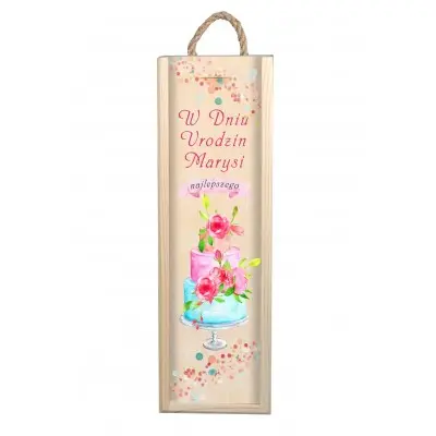 Szukasz pomysłu na niecodzienny prezent na urodziny? Drewniana skrzynka to indywidualny i niepowtarzalny upominek, który z pewnością ucieszy solenizanta. Dzięki personalizacji, prezent nabierze oryginalnego charakteru i będzie wyjątkową pamiątką na lata. Może przydać się nie tylko do przechowywania alkoholu, ale także na trzymanie w niej innych przedmiotów i drobiazgów. Na wysuwanej deseczce nadrukowany jest różowy tekst oraz grafika przedstawiająca tort.