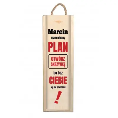 Szukasz pomysłu na osobliwy prezent na urodziny lub na inną okazję? Drewniana skrzynka to indywidualny i niepowtarzalny upominek, który z pewnością ucieszy obdarowanego. Dzięki personalizacji, prezent nabierze oryginalnego charakteru i będzie wyjątkową pamiątką na lata. Może przydać się nie tylko do przechowywania alkoholu, ale także na trzymanie w niej innych przedmiotów i drobiazgów. Na wysuwanej deseczce nadrukowany jest tekst: „Imię + mam niecny plan, otwórz skrzynkę, bo bez ciebie się nie powiedzie!” w czerwono-czarnej kolorystyce.