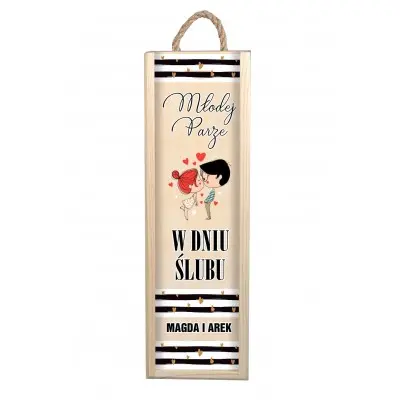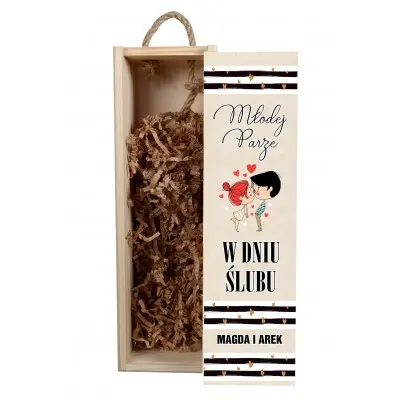 Szukasz pomysłu na niesamowity prezent ślubny? Drewniana skrzynka to indywidualny i niepowtarzalny upominek, który z pewnością ucieszy nowożeńców. Dzięki personalizacji, prezent nabierze oryginalnego charakteru i będzie wyjątkową pamiątką na lata. Może przydać się nie tylko do przechowywania alkoholu, ale także na trzymanie w niej innych przedmiotów i drobiazgów. Zawiera nadruk w biało-czarnej kolorystyce, tekst: „Młodej parze w dniu ślubu” oraz grafikę przedstawiającą całującą się parę.
