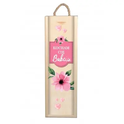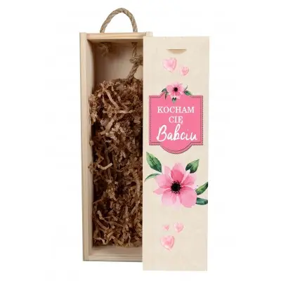 Szukasz pomysłu na niestandardowy prezent na dzień babci lub na inną wyjątkową okazję? Drewniana skrzynka to indywidualny i niepowtarzalny upominek, który z pewnością ucieszy Twoją babcię. Dzięki personalizacji, prezent nabierze oryginalnego charakteru i będzie wyjątkową pamiątką na lata. Może przydać się nie tylko do przechowywania alkoholu, ale także na trzymanie w niej innych przedmiotów i drobiazgów. Na przodzie skrzynki nadrukowany jest tekst „Kocham Cię babciu” oraz grafiką różowych kwiatów.