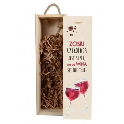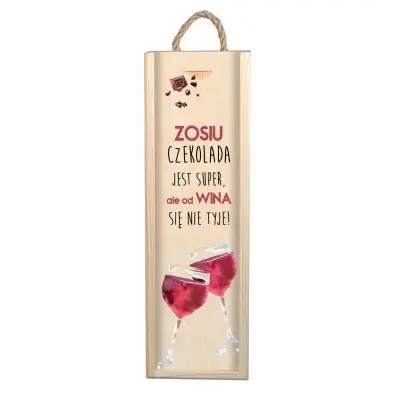 Szukasz niecodziennego prezentu dla bliskiego? Dobrze trafiłeś. Oto nasza wyjątkowa skrzynka na alkohol. Jest to wyjątkowy i spersonalizowany prezent na każdą okazję. Spraw swojemu bliskiemu niezwykłą przyjemność wręczając tą skrzynkę, która jest wysokiej jakości i wykonana z największą starannością. Przyda się nie tylko do trzymania alkoholu, ale także do przechowywania różnych drobiazgów lub cennych przedmiotów. Na wysuwanej deseczce nadrukowany jest tekst w różowo-czarnej kolorystyce oraz grafika przedstawiająca dwa kieliszki z winem.