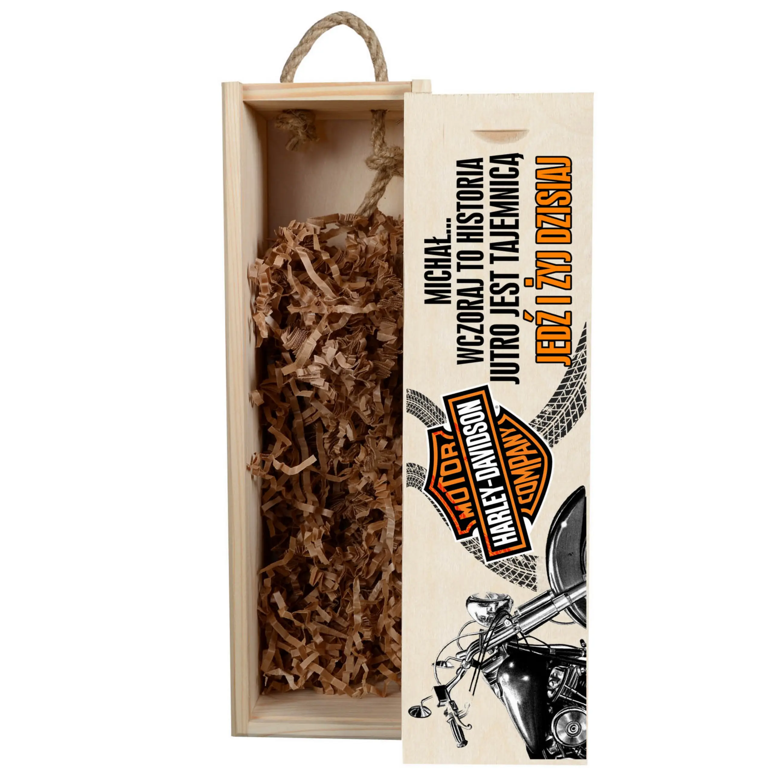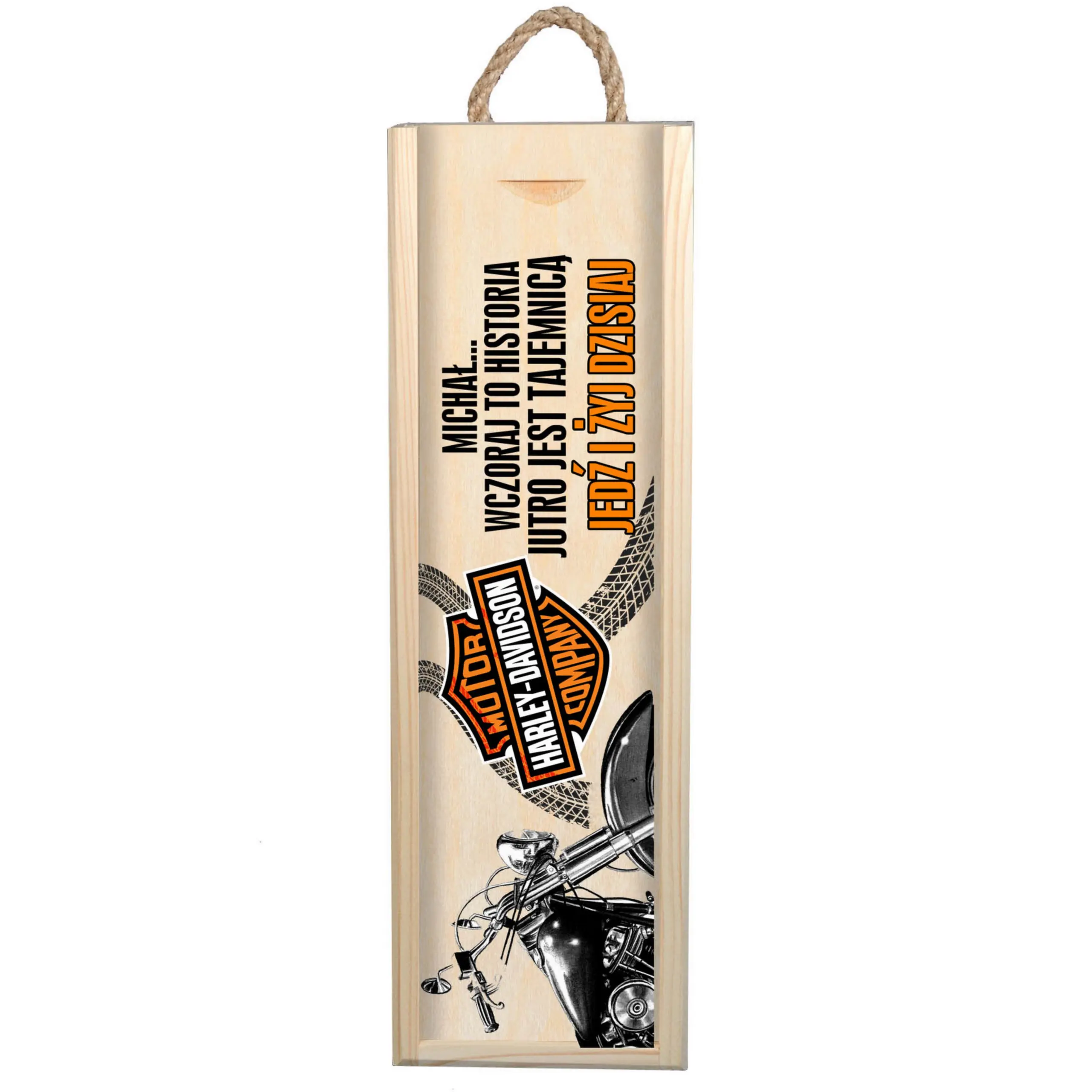 Szukasz prezentu dla wielbiciela motoryzacji, który jest również koneserem alkoholu? Świetnie trafiłeś. Oto skrzynka na alkohol z nadrukowanym motocyklem oraz logiem Harley’a. Może przydać się nie tylko do przechowywania alkoholu, ale także na trzymanie w niej innych przedmiotów i drobiazgów. Oprócz grafiki zawiera też tekst: „Wczoraj to historia, jutro to tajemnica, jedz i żyj teraz”. Imię zawarte na skrzynce ma możliwość personalizacji.