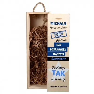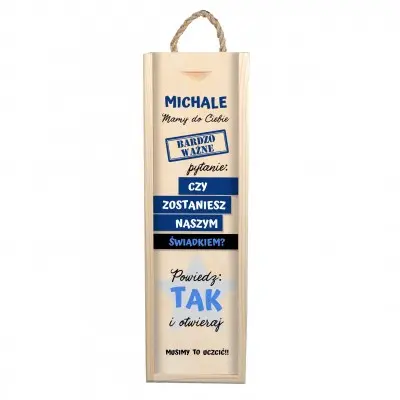 Szukasz pomysłu jak w nietypowy sposób zapytać o zostanie świadkiem na Waszym ślubie? Oto nasza propozycja. Przedstawiamy skrzynkę na alkohol, na której znajduje się nadruk z tekstem: „Michale, mamy dla ciebie bardzo ważne pytanie: czy zostaniesz naszym świadkiem? Powiedz TAK i otwieraj. Musimy to uczcić”. Imię zawarte na skrzynce ma możliwość personalizacji. Posiadamy również wersję dla świadkowej. Skrzynka może przydać się nie tylko do przechowywania alkoholu, ale także na trzymanie w niej innych przedmiotów i drobiazgów.