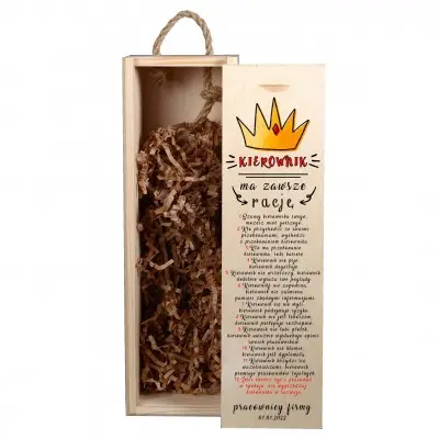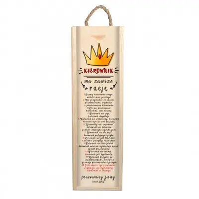 Poszukujesz oryginalnego prezentu dla kierownika z okazji jego urodzin lub podziękowania? Przedstawiamy niepowtarzalną skrzynkę na alkohol z personalizowanym grawerem, która z pewnością sprawi zadowolenie na twarzy obdarowanego. Może przydać się nie tylko do przechowywania alkoholu, ale także na trzymanie w niej drobiazgów. Skrzynka posiada zasuwane wieczko oraz praktyczny uchwyt ze sznura jutowego.