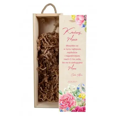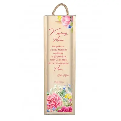 Nie masz pomysłu na prezent z okazji urodzin mamy lub dnia matki? Szukasz czegoś jedynego w swoim rodzaju? Oto nasza propozycja. Skrzynka na wino z oryginalnym nadrukiem jest efektowna, może przydać się nie tylko do przechowywania alkoholu, ale także na trzymanie w niej innych przedmiotów i drobiazgów. W dodatku skrzynka jest personalizowana, więc nigdzie nie znajdziesz takiej samej. Na przodzie skrzynki przedstawiony jest tekst w różowej kolorystyce oraz grafika kwiatów.