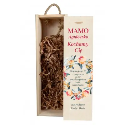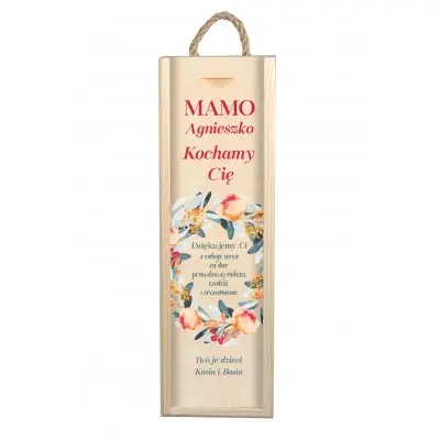 Drewniana skrzynka na wino z życzeniami i dedykacją to z pewnością trafiony pomysł na miły upominek dla mamy.