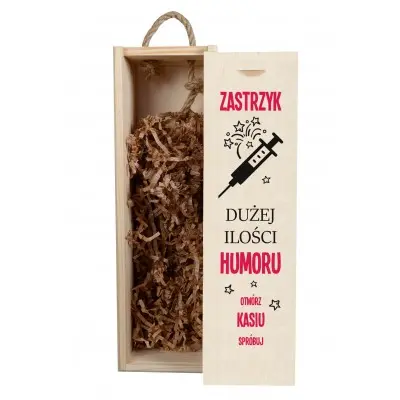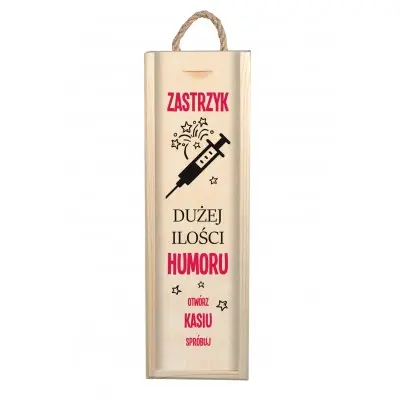 Skrzynka na wino to efektowny i funkcjonalny prezent. Jeśli szukasz czegoś na drobny prezent to dekoracyjna skrzynka na alkohol będzie strzałem w dziesiątkę. W skrzynce można umieścić wino, wódkę lub nalewkę własnej produkcji. Zaskocz bliskiego tym wyjątkowym pomysłem na prezent na każdą okazję. Jest starannie zaprojektowana i wygrawerowana. Zawiera zabawny, entuzjastyczny tekst i czarną grafikę w postaci strzykawki. Skrzynka jest personalizowana, dlatego nigdzie nie znajdziesz drugiej takiej samej.