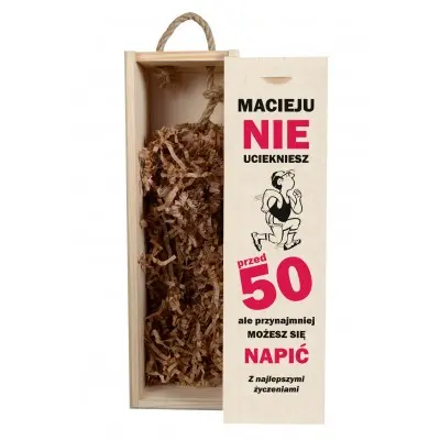 Zaskocz swojego brata, przyjaciela, tatę lub dziadka tym niesamowitym pomysłem na prezent! Skrzynka na wino z oryginalnym nadrukiem jest efektowna, może przydać się do przechowywania innych przedmiotów i drobiazgów. Wybierz ten niepowtarzalny prezent i zachwyć oryginalnością i wyjątkowością swojego pomysłu. Skrzynka zawiera imię solenizanta, tekst: „Nie uciekniesz przed 50, ale przynajmniej możesz się napić. Z najlepszymi życzeniami” oraz animowaną grafiką.
