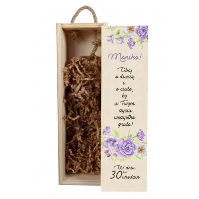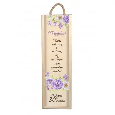 Niepowtarzalna skrzynka na alkohol z personalizowanym grawerem jest prezentem, który z pewnością wywoła uśmiech na twarzy obdarowanej osoby i będzie zapamiętamy na długo. Może przydać się nie tylko do przechowywania alkoholu, ale także na trzymanie w niej innych przedmiotów i drobiazgów. Nadruk jest starannie wykonany. Skrzynka ozdobiona piękną grafiką kwiatową, zawierająca imię solenizantki oraz krótkie rymowane życzenia.
