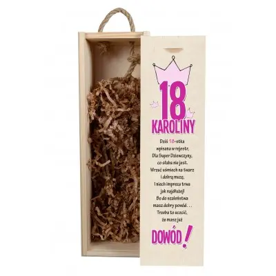 Zaskocz swoją przyjaciółkę/siostrę tym wyjątkowym pomysłem na prezent! Skrzynka na wino z oryginalnym nadrukiem jest efektowna, może przydać się nie tylko do przechowywania alkoholu, ale także na trzymanie w niej innych przedmiotów i drobiazgów. Jest wysokiej jakości. Wybierz ten niepowtarzalny prezent i zachwyć oryginalnością i wyjątkowością swojego pomysłu. Skrzynka z napisem „18” i animowaną koroną, imieniem solenizantki oraz wystrzałowymi życzeniami.
