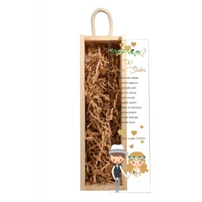 Elegancka, personalizowana skrzynka na wino została wykonana z wysokiej jakości drewna sosnowego, z wieczkiem ze szkła akrylowego i wygodnym uchwytem z naturalnego sznurka.  Jest to świetna oprawa dla każdego trunku, który chcemy podarować w prezencie.