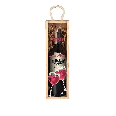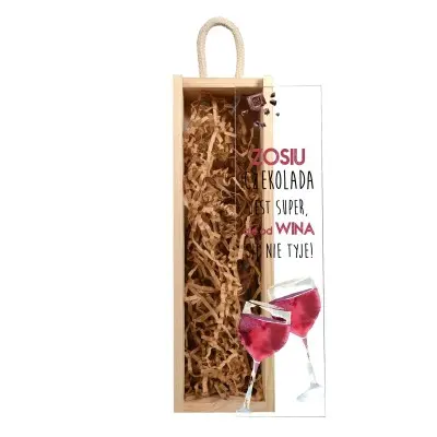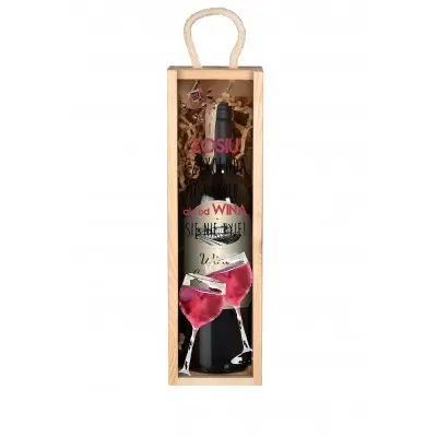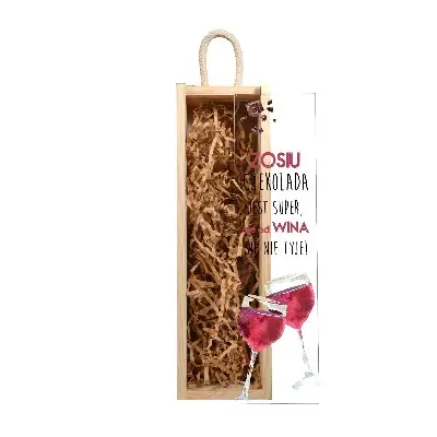 Elegancka, personalizowana skrzynka na wino została wykonana z wysokiej jakości drewna sosnowego, z wieczkiem ze szkła akrylowego i wygodnym uchwytem z naturalnego sznurka.  Jest to świetna oprawa dla każdego trunku, który chcemy podarować w prezencie.