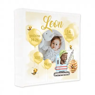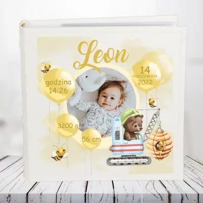 Okładka przedstawia zdjęcie dziecka ozdobione żółtymi balonikami, na których znajdują się dane dziecka, całość dopełniają pszczółki w tle