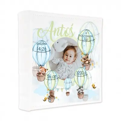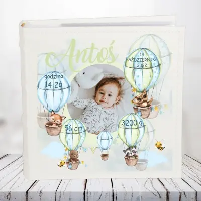 Okładka przedstawia zdjęcie dziecka ozdobione kolorowymi balonikami, na których znajdują się dane dziecka, całość dopełniają chmurki w tle