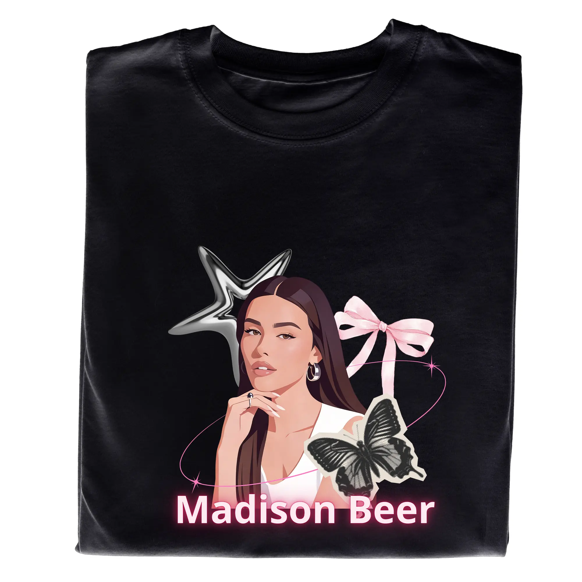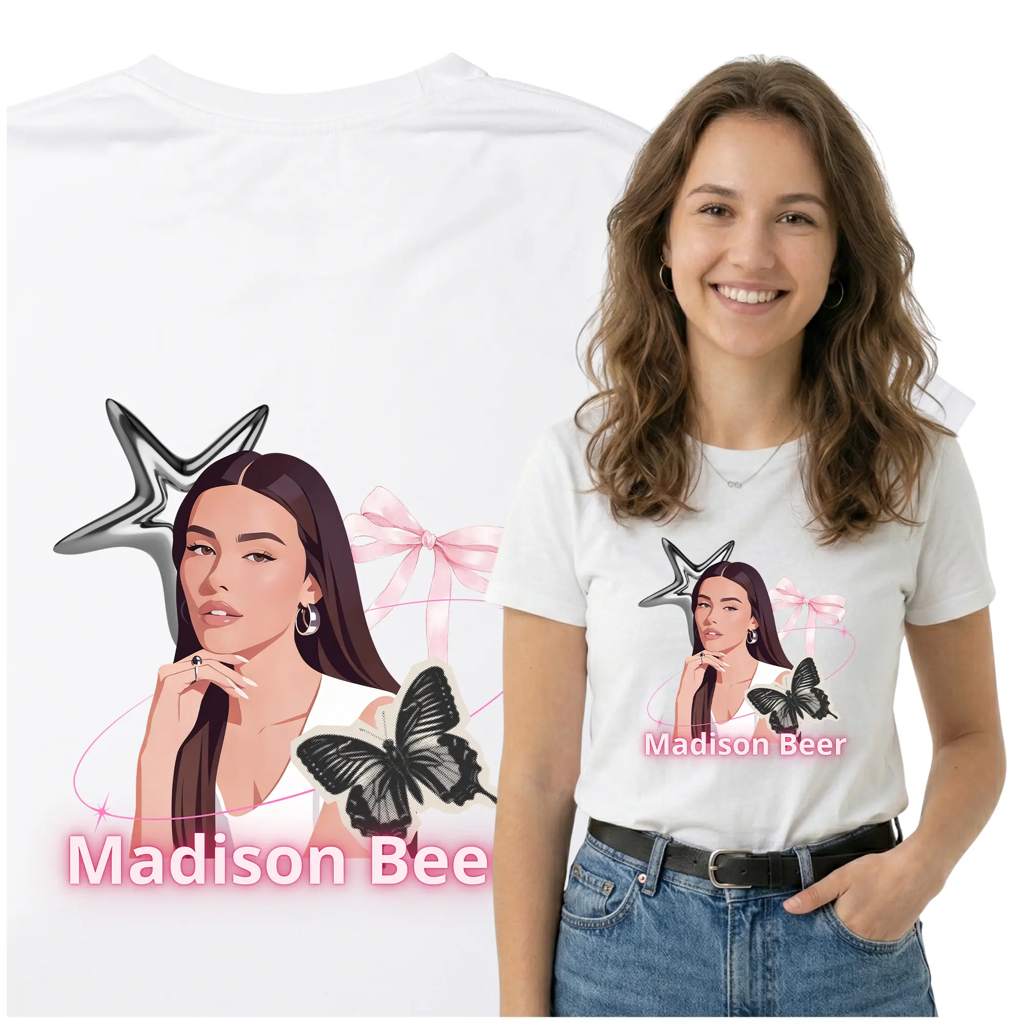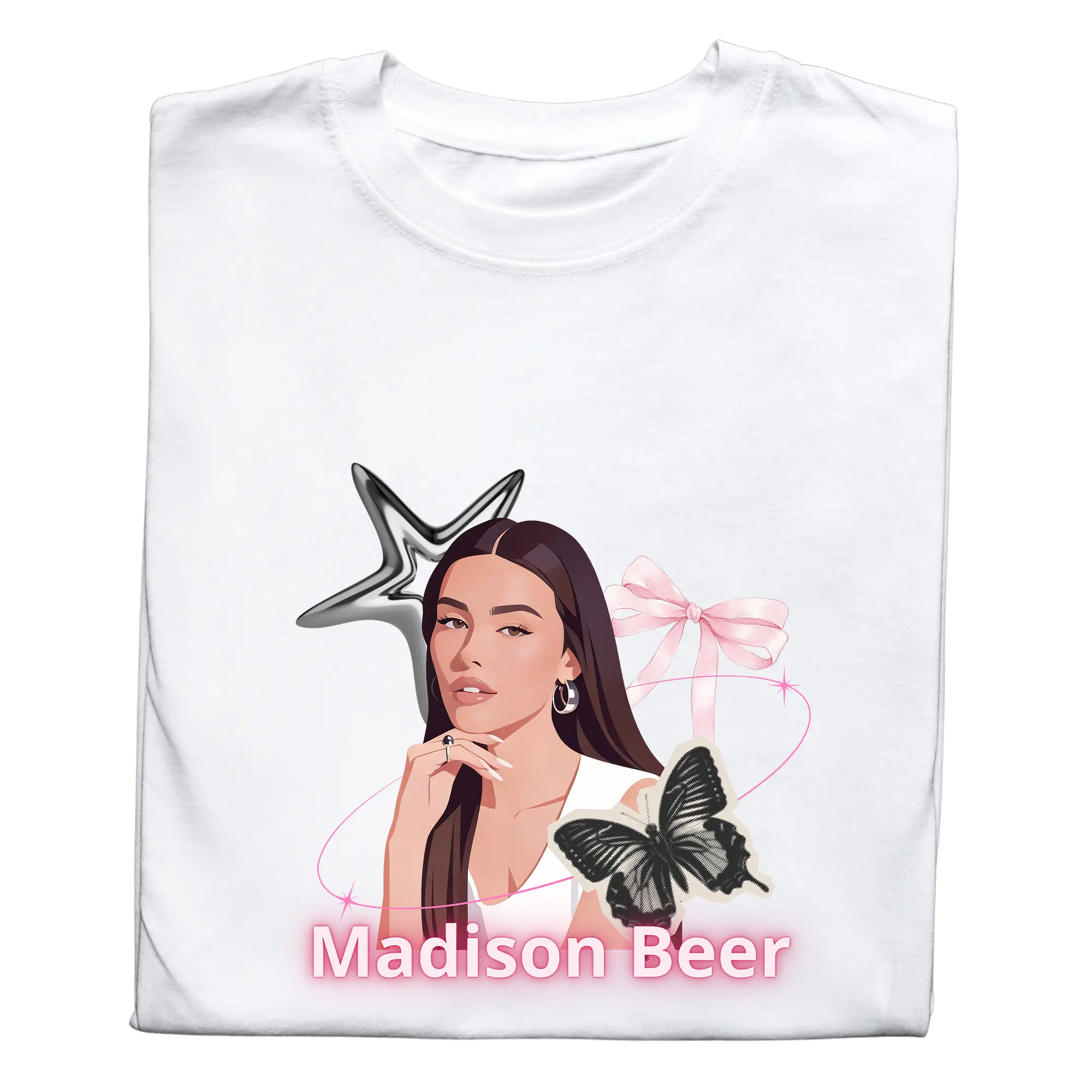 Stylowa koszulka Madison Beer to doskonały wybór dla każdego fana amerykańskiej wokalistki Madison Beer. Modny t-shirt z nadrukiem inspirowany jej twórczością pozwala wyróżnić się w tłumie i pokazać swoją pasję do muzyki pop. Koszulka wykonana jest z wysokiej jakości materiału, który zapewnia wygodę noszenia przez cały dzień – na koncertach, spotkaniach ze znajomymi lub w codziennych stylizacjach. Trwały nadruk zachowuje intensywne kolory nawet po wielu praniach, a klasyczny krój sprawia, że koszulka pasuje do każdego stylu.