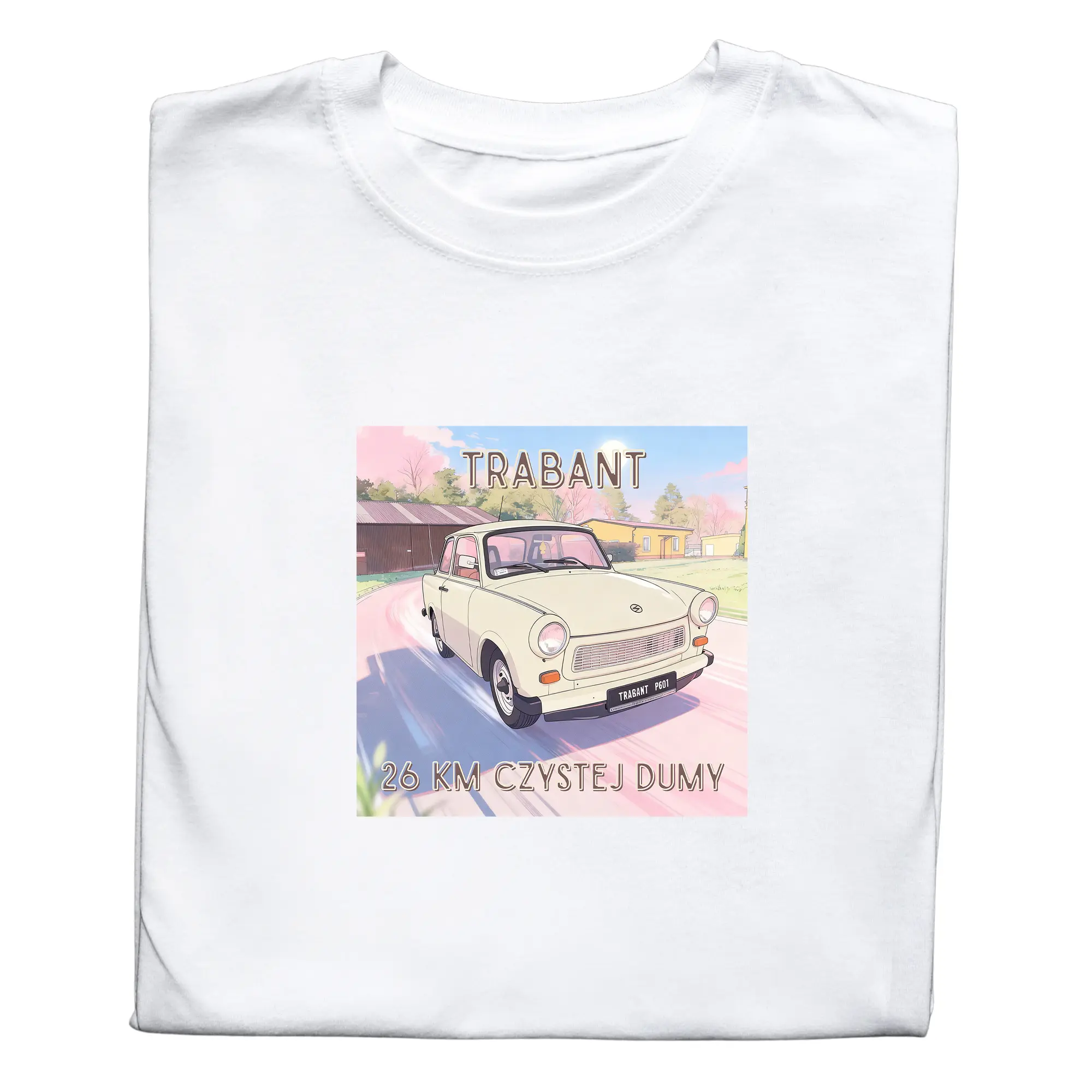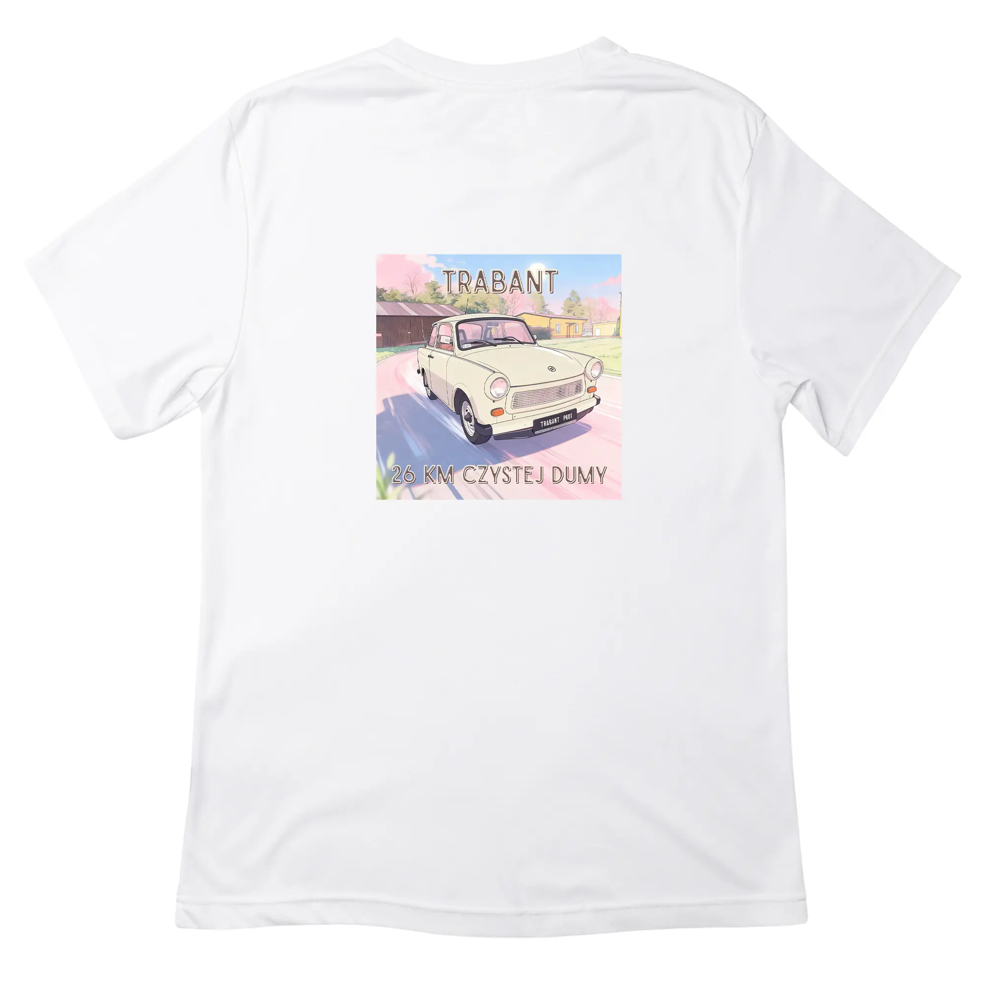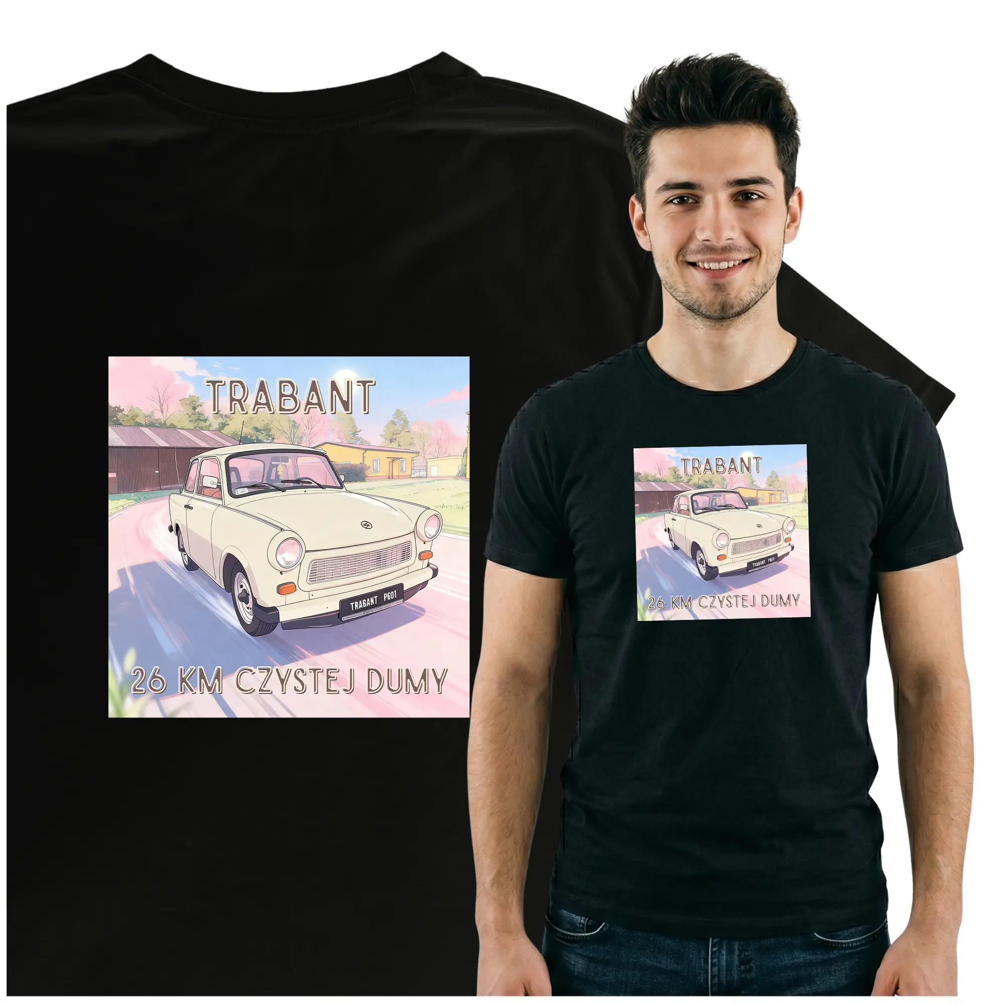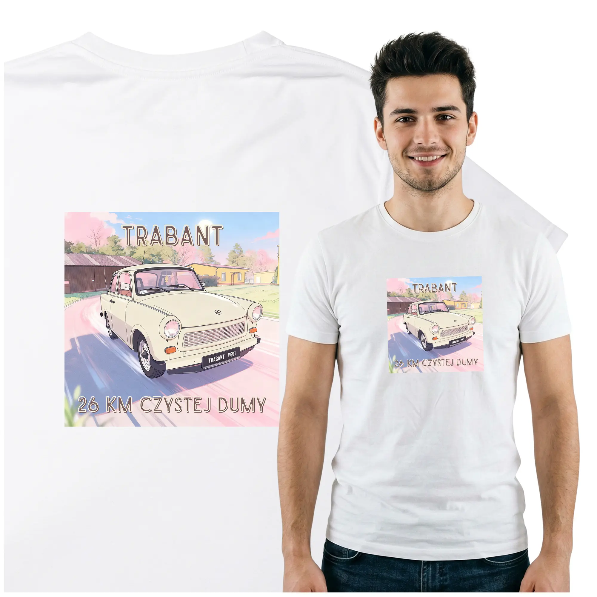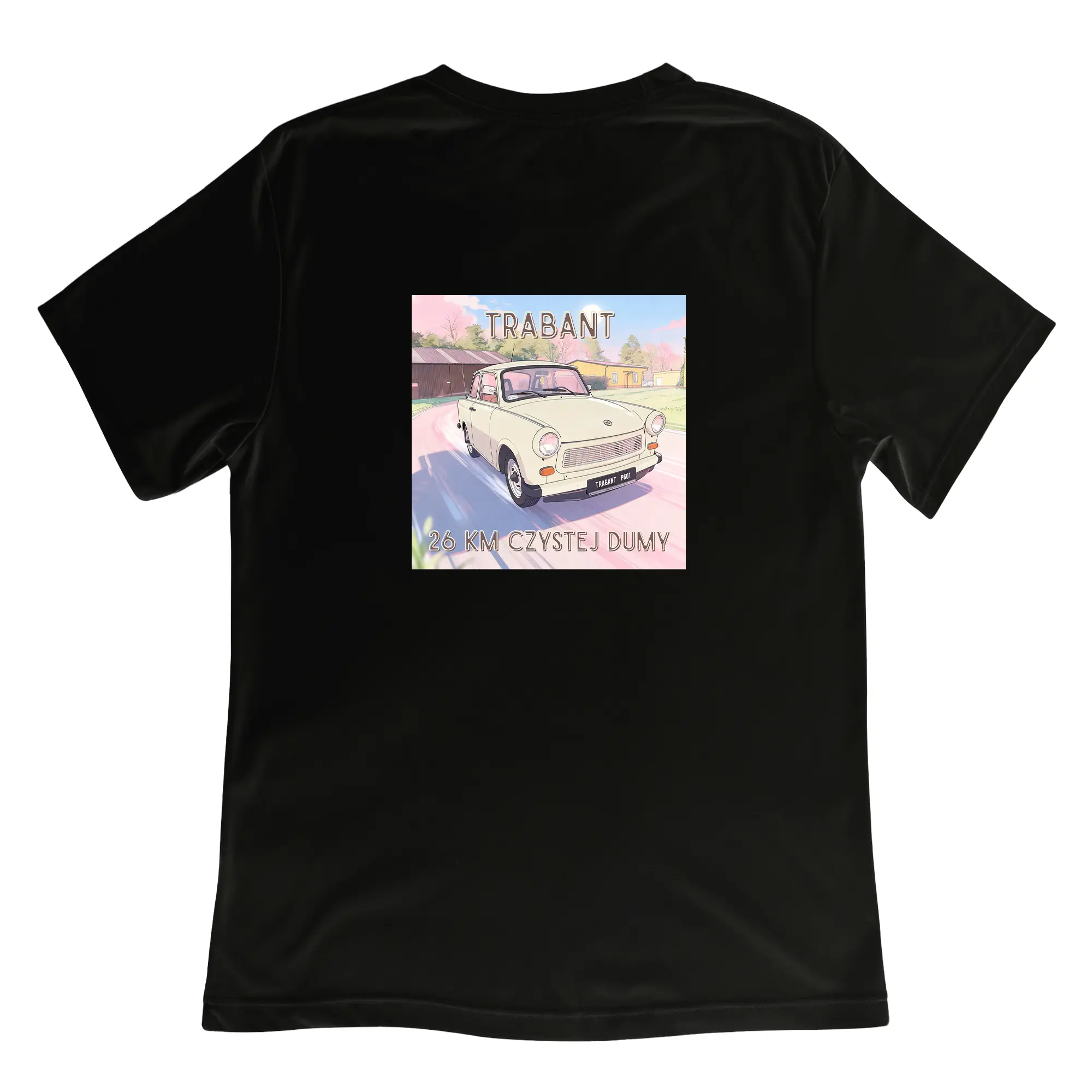 Stylowa koszulka z nadrukiem Trabant to doskonały wybór dla każdego miłośnika klasycznych samochodów i motoryzacji z czasów PRL. Nadruk przedstawia kultowy Trabant, który stał się symbolem epoki i pasji do historycznych modeli samochodów.