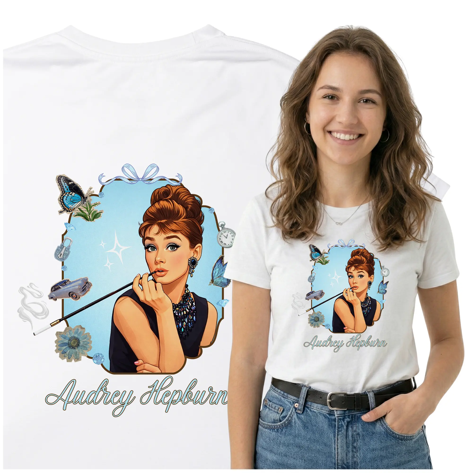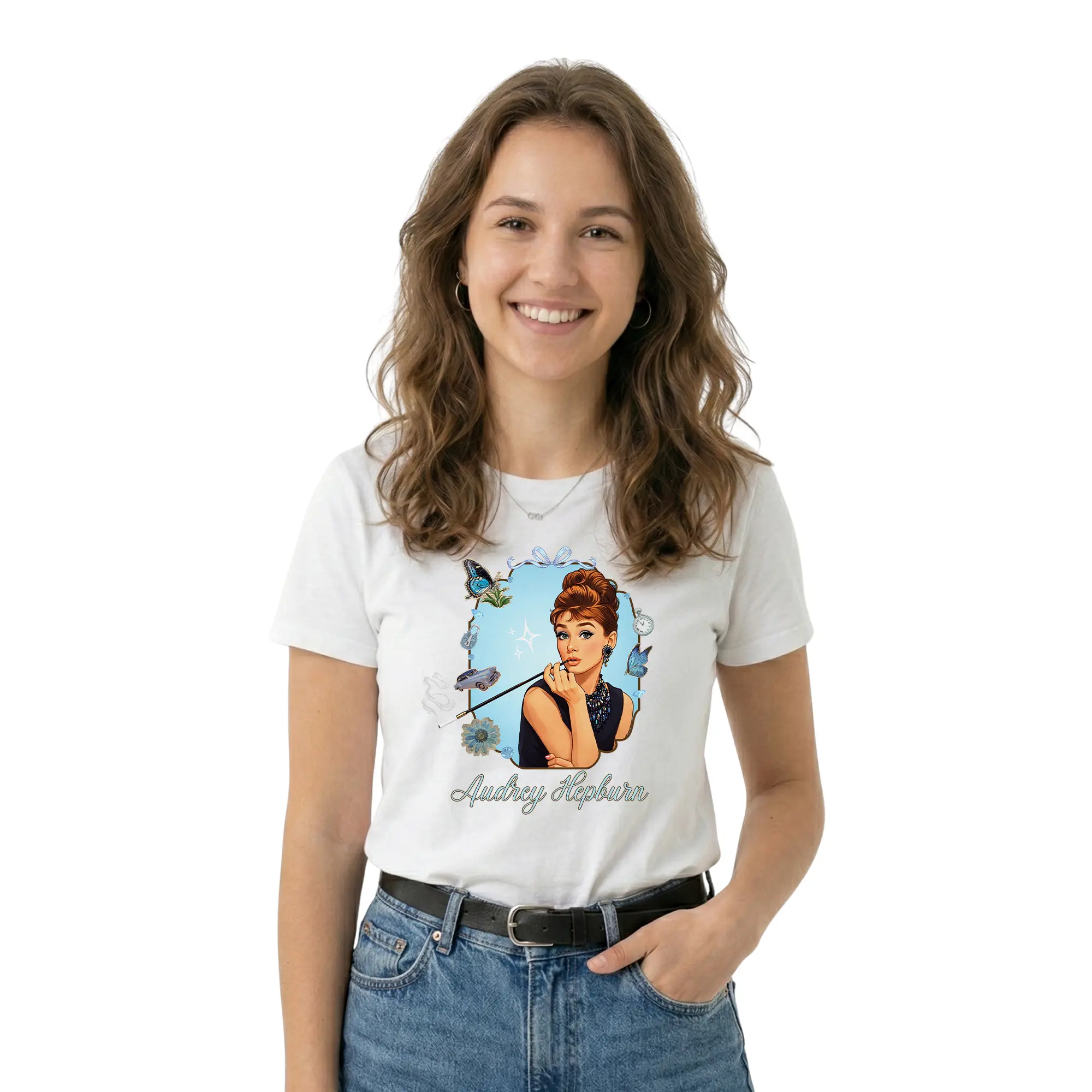 Stylowa koszulka Audrey Hepburn to doskonały wybór dla miłośników klasycznego kina i ponadczasowej elegancji Audrey Hepburn. T-shirt z nadrukiem inspirowanym ikoną stylu pozwala wyróżnić się i dodać swoim stylizacjom wyjątkowego, filmowego charakteru. Koszulka wykonana jest z wysokiej jakości materiału, który zapewnia komfort noszenia przez cały dzień – w pracy, na spotkaniach ze znajomymi czy podczas wyjątkowych okazji. Trwały nadruk zachowuje intensywne kolory nawet po wielu praniach, a klasyczny krój sprawia, że pasuje do każdego stylu.
